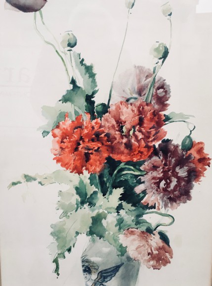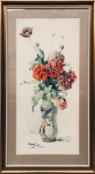 Spectaculaire aquarelle de grande dimension pour cette œuvre representant un bouquet de pivoines. Les fleurs sont posées dans un vase renaissance, de style Albarello, au décor d’un ange ailé tenant une balance, symbolisant la justice. signée Seebach dans le bas droit.