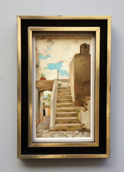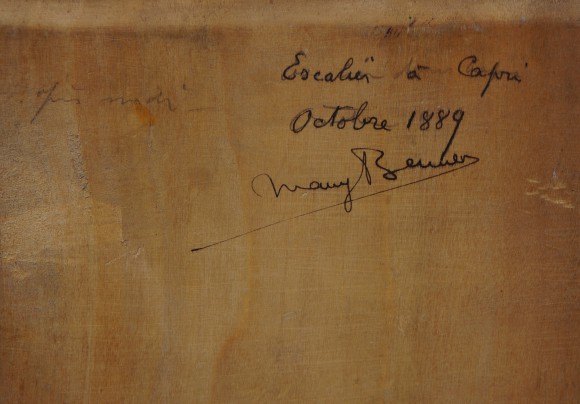 Œuvre de jeunesse de Many Benner, située Escalier à Capri datée 1889 signée et datée au verso. huile sur panneau de bois . Jean Benner, le père de Many allait régulièrement à Capri, il y rencontra sa future épouse, Many est donc né sur cette ile. Bien que vivant à Paris, la famille Benner garda ses attaches avec Capri et y retourna régulièrement, tout naturellement, l'ambiance capriote servi de cadre à de nombreuses œuvres signées par Emmanuel, Jean et Many Benner.