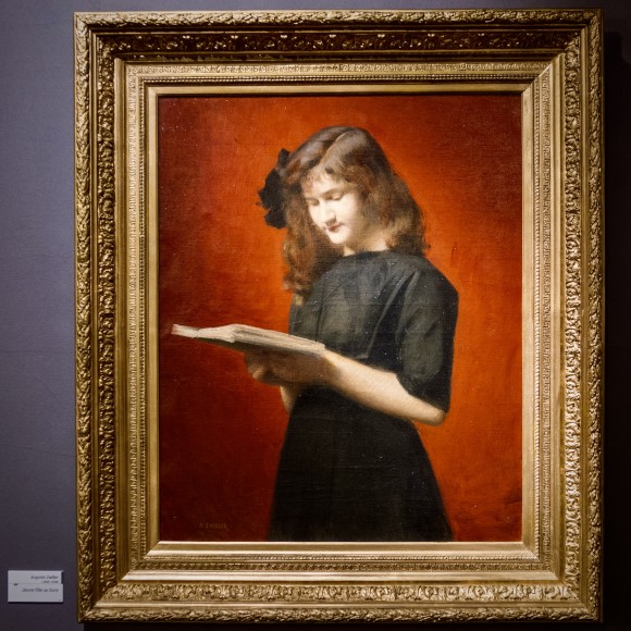 On retrouve ici la maîtrise incontestée de Marie Augustin Zwiller pour ses rendus dans le domaine du portrait. Ici le prétexte du livre induit une position de la tête légèrement inclinée vers l'avant et permet d'apprécier tous les détails du charmant visage de la jeune fille, le tombé de la chevelure qui en découle accentue le contraste et le jeu de lumière valorise la carnation, Zwiller s'approche ici de la maîtrise dans ce domaine de Jean Jacques Henner . La tenue du livre met en valeur des mains délicates dont le fini et le détail est remarquable . Zwiller apportait également un soin extrême au traitement des fonds, ici le rendu dans des tonalités de rouge est de haut niveau. Huile sur toile signée A. Zwiller