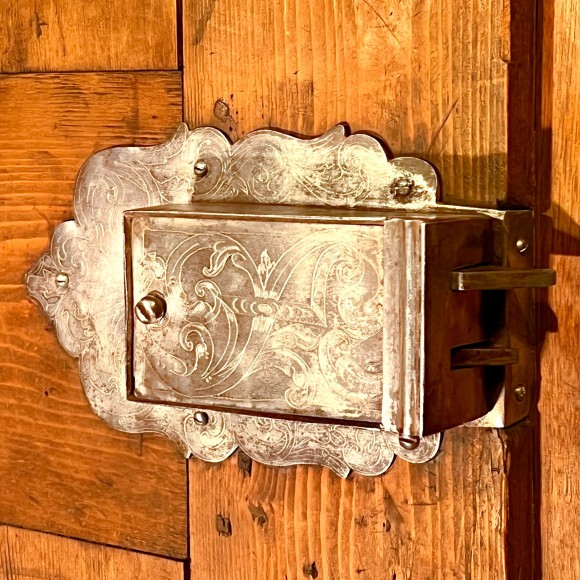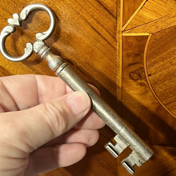 Les entrées de serrure sont en laiton, décor de feuilles au repoussé, et l’ouverture des portes laisse découvrir une magnifique serrure et des pentures d’époque en fer gravé de rinceaux et feuillages, la clef, également ancienne, est surmontée d’un cœur sur le haut de l’anneau, peut-être s’agit il d’une armoire de mariage.