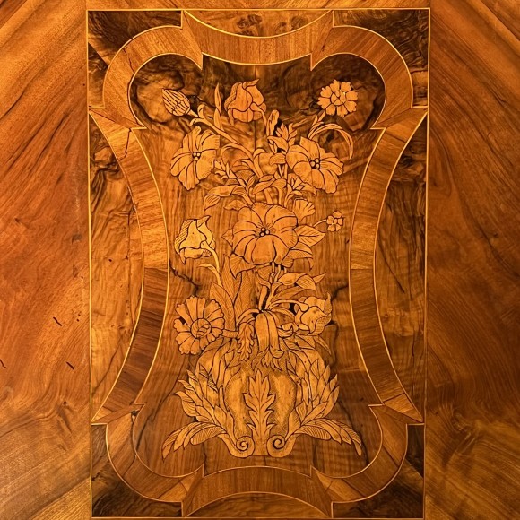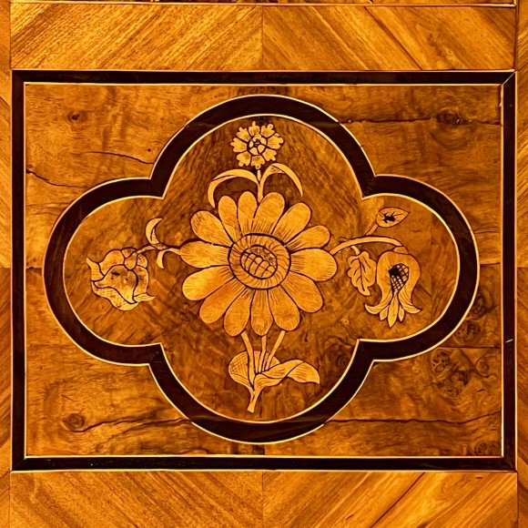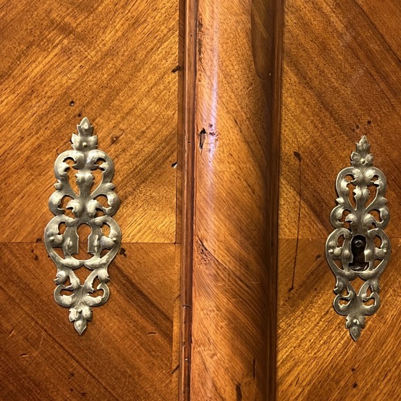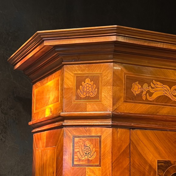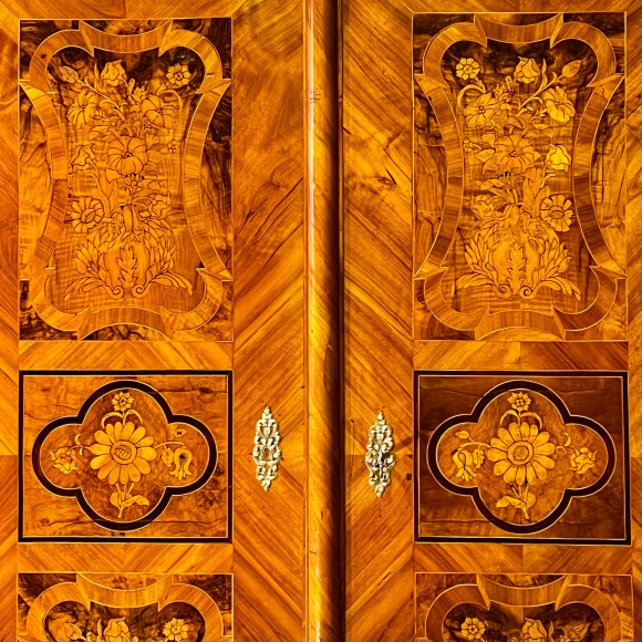Belle armoire d’apparat, ce meuble est habillé de larges frisages de noyer contournés de filets alternants bois clair, de l’érable, et foncé, du cormier, enserrant des réserves marquetées de chutes de fleurs et de feuillages sur les pilastres d’angle et le bandeau supérieur. Au centre de la corniche, un cartouche marqueté d’un aigle à deux têtes, emblème couramment utilisé en héraldique par les nobles familles de l’empire des Habsbourg d’Autriche dès la fin du XVI ème siècle . Les portes sont divisées en 3 panneaux, dont le médian présente une réserve quadrilobée comportant une fleur insérée dans chaque quart, celle au départ du lobe inférieur se développe au centre en un large bouton ouvert. De part et d’autre de cet axe médian 4 panneaux symétriques délimitent, par un large filet au contour chantourné, un espace tel une plate bande simulée, habillé d’une large composition florale aux tiges multiples.