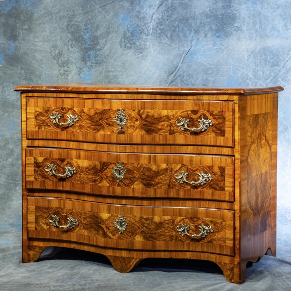 Belles proportions pour cette petite commode galbée décorée d'entrelacs, marquetée de noyer et de prunier , bords du plateau en bois de bout. ,Bâti en résineux. Sud de l'Alsace . Epoque XVIII ème siècle .