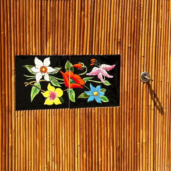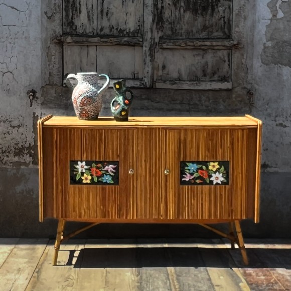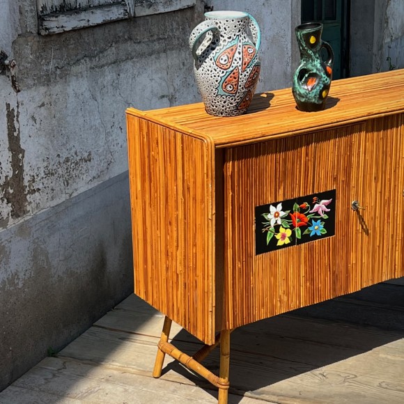 Buffet vintage, recouvert de Bambou avec insertions de céramiques, rare et sympathique modèle pour une ambiance véranda réussie. Fabrication des Années 1960.