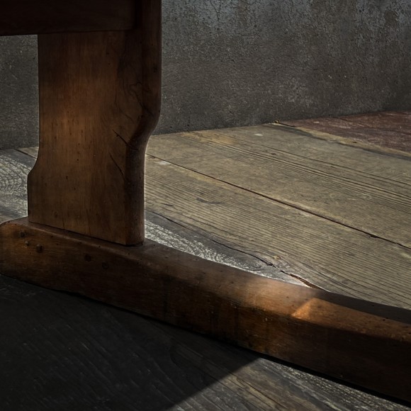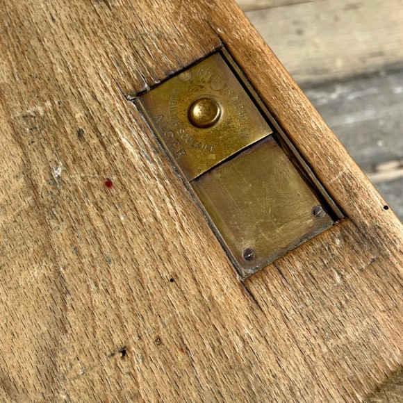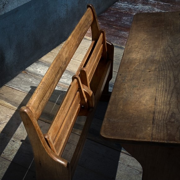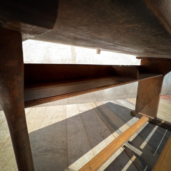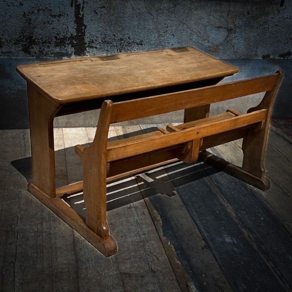 Ce bureau d’écolier double, bénéficie d’une très belle patine, les traverses sont bien usées attestant un usage important. Ensemble en bois massif de conception très robuste, les sièges sont avec des assises à claires voies redevables et pivotants sur deux axes avec support en bois, deux plumiers sont creusés dans le plateau , l’encrier est protégé par un boîtier en laiton avec couvercle coulissant découvrant un godet en porcelaine blanche, (il manque un des deux godets) sur le couvercle une marque de fabrique : Paillon mobiler pour école à Alger . Sous le plan de travail une étagère de rangement . Époque fin XIX ème