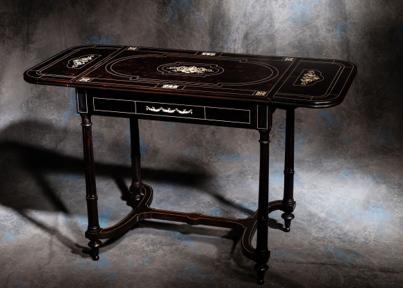 Table à écrire d'époque Napoléon III,à deux tiroirs, disposant d'extensions latérales et rabattables, marquetée d'une mosaïque d'ébène et incrustée de motifs floraux et filets d'ivoire, élégante et raffinée cette agrémentera aussi bien un salon contemporain qu'un intérieur traité dans le gout de l'ancien.