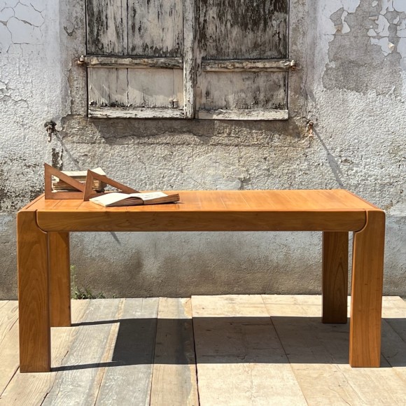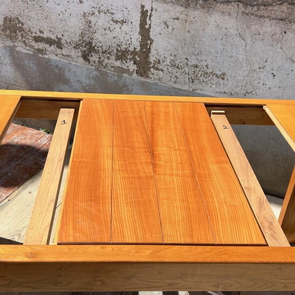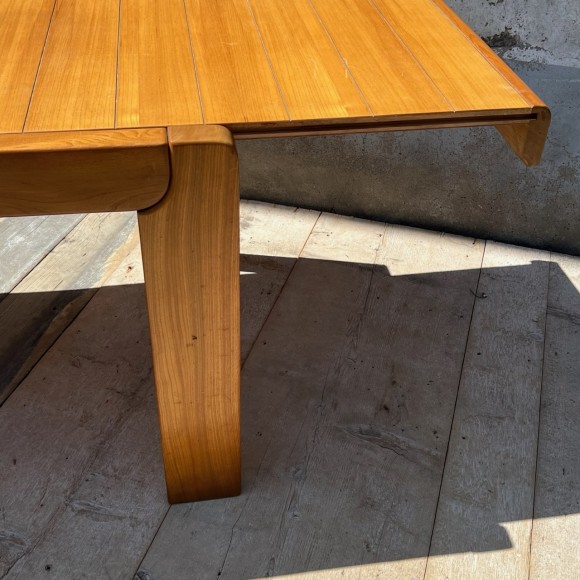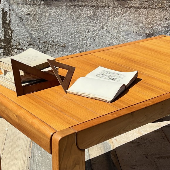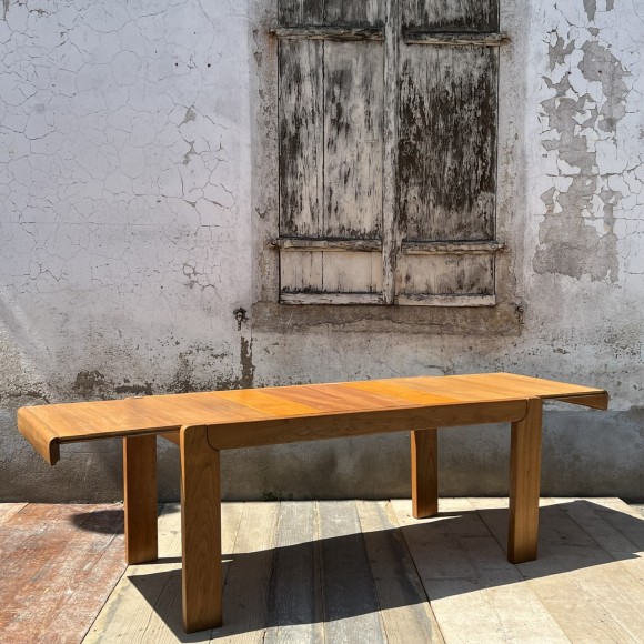 Beau design pour cette table rectangulaire et extensible, avec ce raccord circulaire du pied sur la ceinture et ce plateau à lames larges, le bois utilisé est l’orme.Elle est issue de l’atelier alsacien Regain Reinhard aujourd’hui disparu, qui fut longtemps spécialisé dans la conception et fabrication de meubles contemporains en orme. Très fonctionnelle, les deux moitiés du plateau , doublés d’orme, coulissent à l’intérieur de la ceinture et découvrent une allonge dans la même esthétique que le plateau principal et qui pivote sur un axe pour se positionner entre les deux autres parties . Deux petites allonges de service permettent d’augmenter la dimension pour arriver à 2,57 m d’ouverture totale.