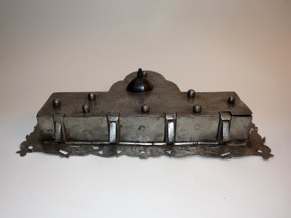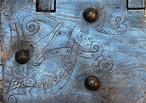 Exceptionnelle serrure de coffre à 4 pennes en fer étamé et gravé de rinceaux, d'animaux fantastiques et d'éléphants.