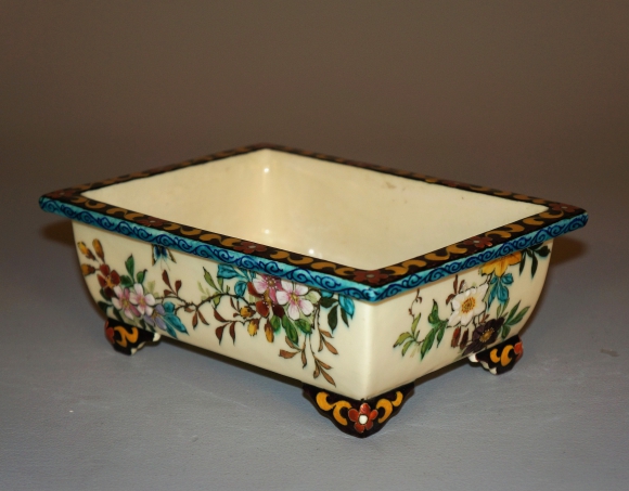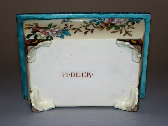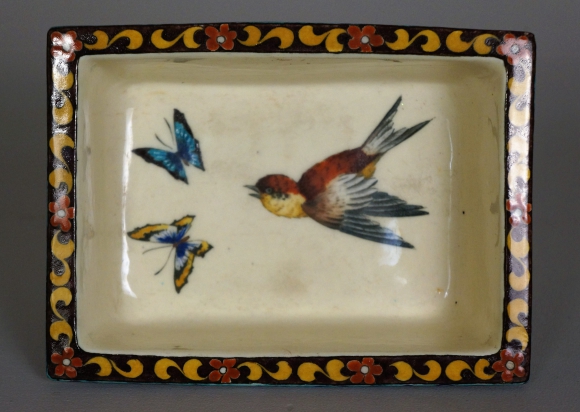 Petite coupe de forme rectangulaire décor fleurs et oiseaux signée TH Deck sous la base.