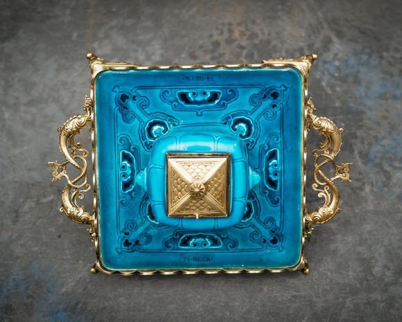 Encrier de section carrée, base bronze ajourée, plateau et godet en céramique émaillée bleu Deck. Signé sous la base Th. Deck.