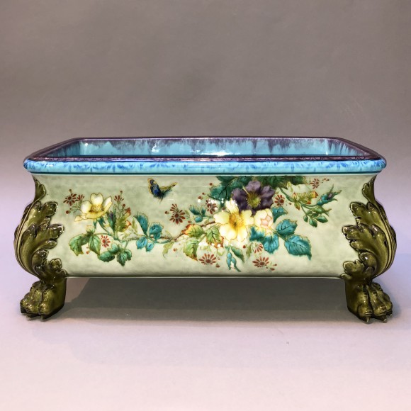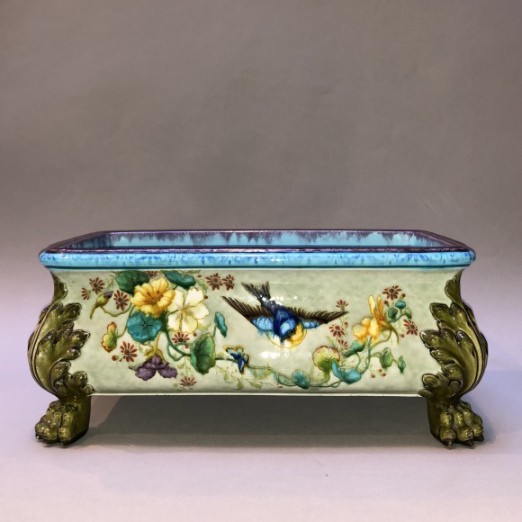 Fond céladon pour le décor japonisant de branches fleuries, oiseaux et papillons de cette jardinière de format rectangulaire, soutenue par des pieds griffes coiffés de feuilles d’acanthe, le pourtour supérieur souligné d’une frise dans les tonalités d’aubergine, intérieur bleu. Tous les critères de la période japonisante des créations des ateliers Théodore Deck sont présents sur cette pièce. Signée sous la base en creux TH. DECK