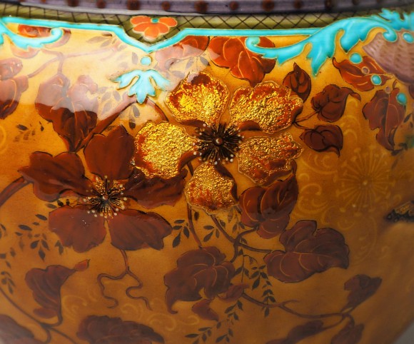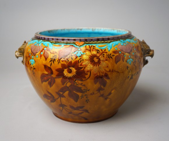 Jardinière de forme circulaire avec anses "têtes de lion", cette pièce au décor de branchages fleuris sur un fond niellé, présente une des spécialités de Deck, les inclusions d'or , utilisé ici pour donner un éclat incomparable aux pétales de fleurs .