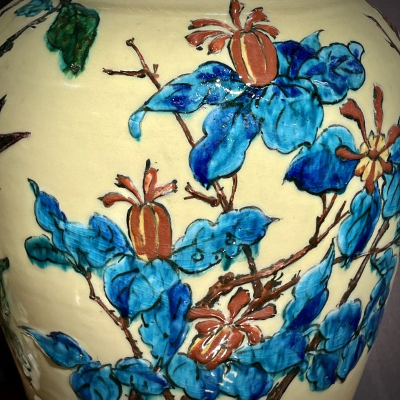 Exceptionnels grands vases formant paire, décor japonisant aux couleurs chatoyantes, un rare fond jaune sur lequel évoluent oiseaux , papillons , abeilles et branches fleuries. Signé sous la base TH. DECK . Théodore Deck ( 1823-1891), céramiste de renommée mondiale, est né en Alsace à Guebwiller. Installé à Paris , il développe avec son frère un atelier de céramiques rapidement reconnu pour ses productions réunissant qualité techniques et artistiques , il obtiendra de nombreuses récompenses lors de sa participation aux grandes expositions sur le dernier tiers du XIX ème siècle.