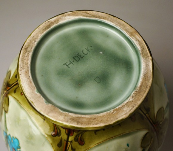 vase en forme de bulbe et decor floral sur fond céladon, signé TH. DECK sous la base.