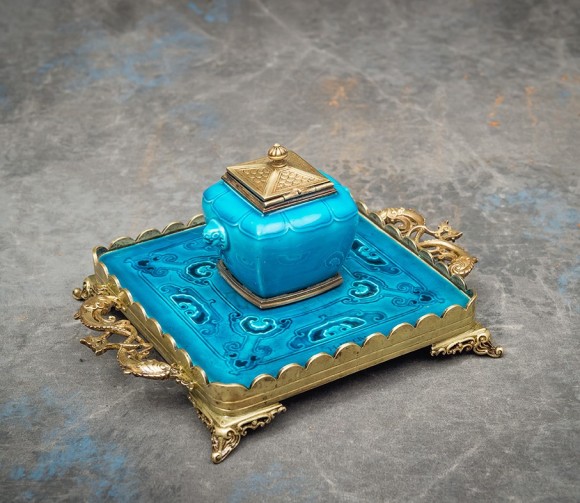 Encrier socle bronze Signé Théodore Deck ( 1823-1